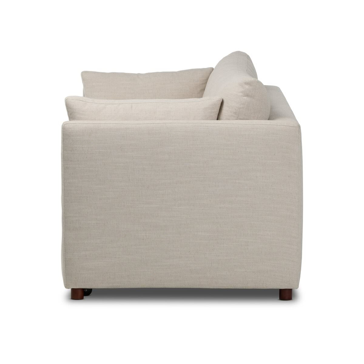 This cleverly designed sleeper sofa hides a Queen-sized bed within its modern silhouette. With a simple roll-out and counterbalanced mechanism, it effortlessly transforms into a bed, making it a space-saving solution with hidden functionality. When unfolded, the cushions form a comfortable bed, perfect for overnight guests or movie nights — no extra mattress necessary.
